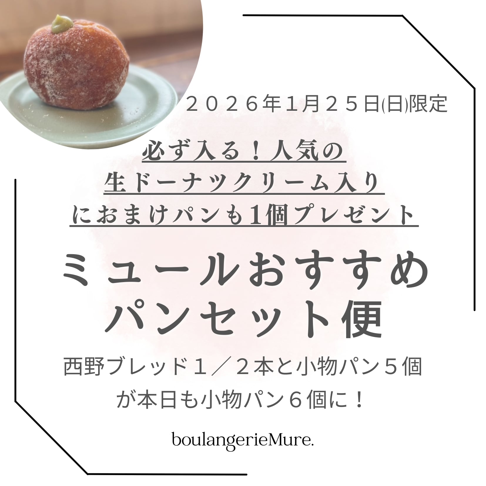 1月25日限定!ミュール人気生ドーナツクリーム入りが必ず入る!+おまけパン1個お付けします【常温便】西野ブレッド角(かく)1/2とミュールおすすめパンセット便